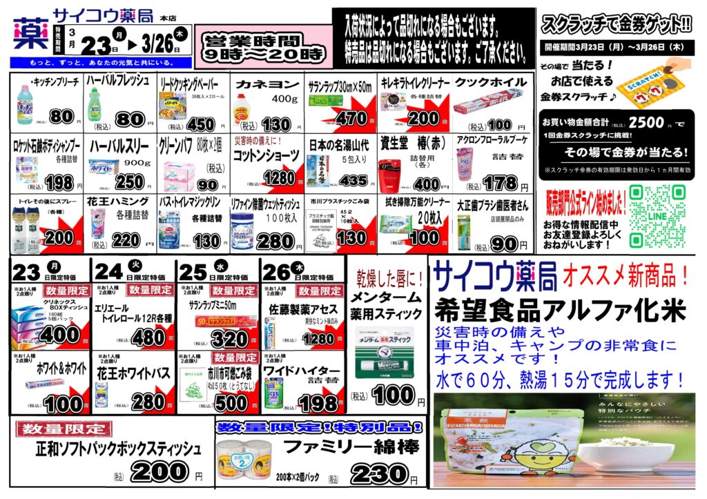 3月23日(月)から3月26日(木)まで特売を開催いたします。