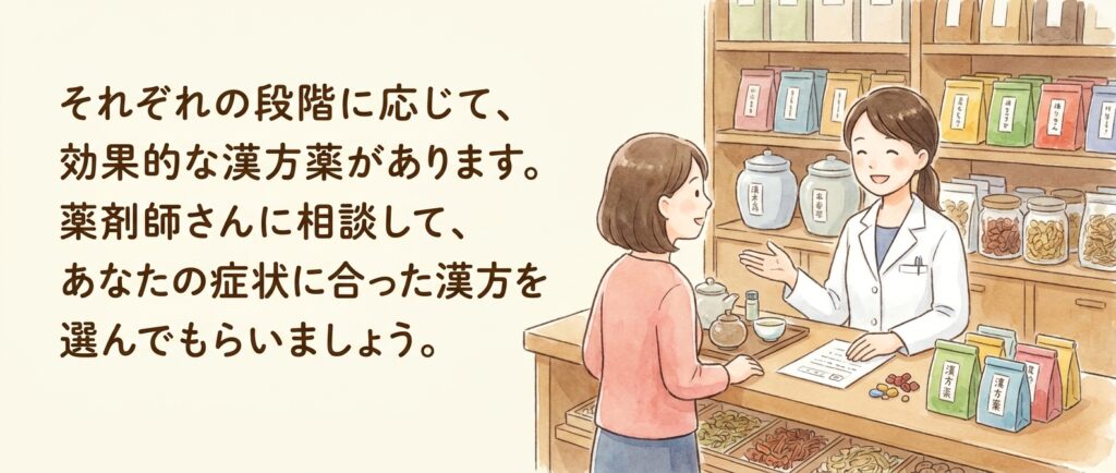 それぞれの段階に応じて、効果的な漢方薬があります。薬剤師さんに相談して、あなたの症状に合った漢方を選んでもらいましょう。