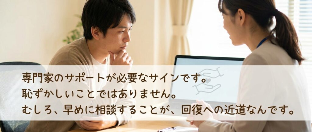 これらは、専門家のサポートが必要なサインです。恥ずかしいことではありません。むしろ、早めに相談することが、回復への近道なんです。
